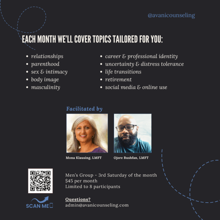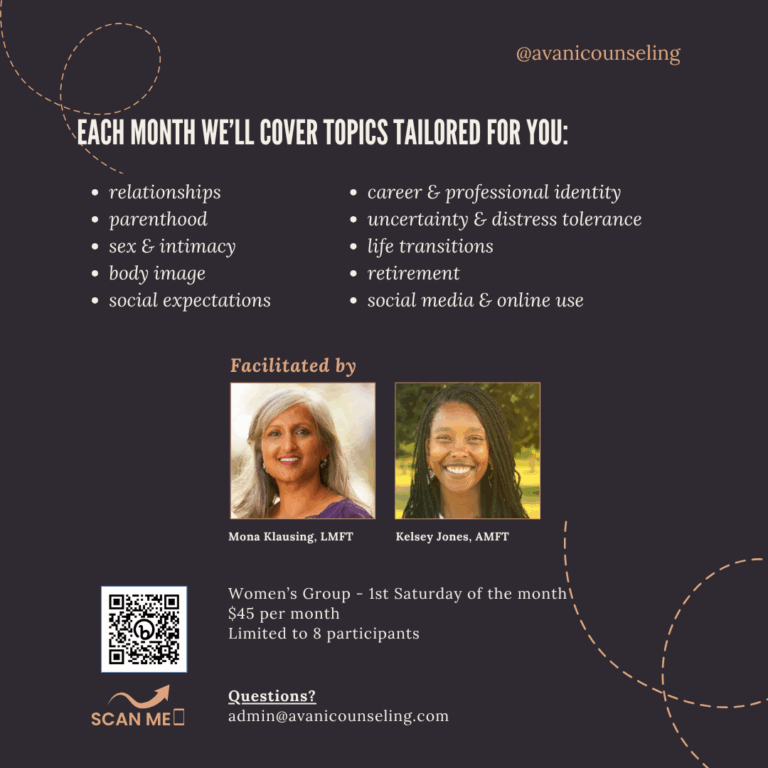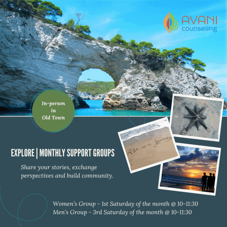 TRANSITIONS | Women’s Support Group – 5-week group therapy, held in-person at our Old Town office, for women of all ages experiencing a life transition. Five 90-minute sessions are offered for $45/session.